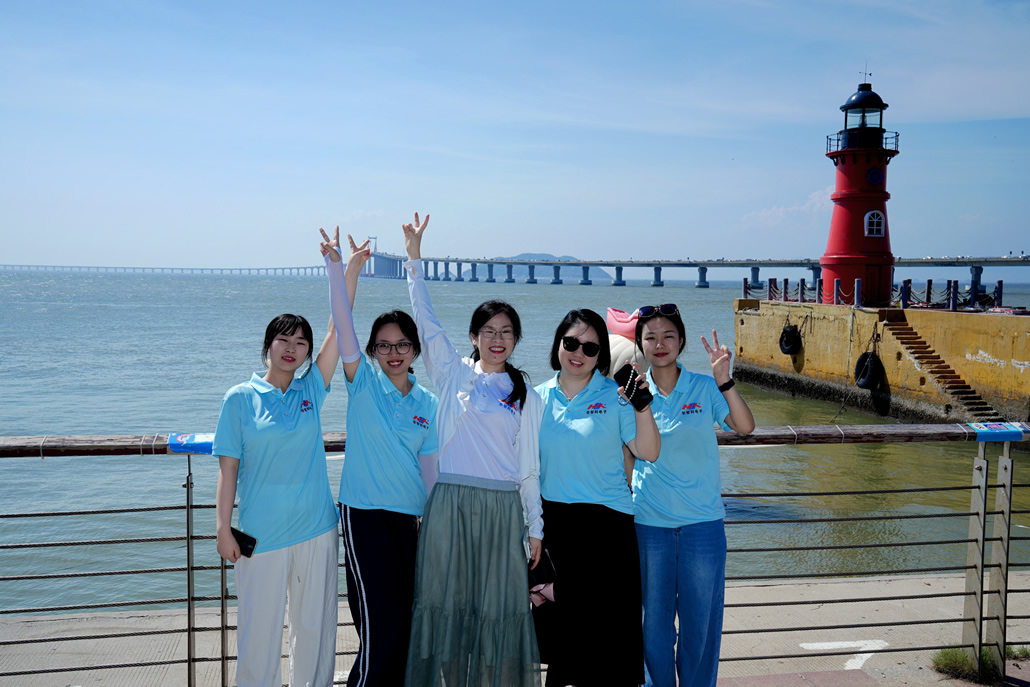 站在啟航廣場燈塔下,我們迎著燦爛的陽光拍下合影。這座燈塔巍然矗立在蔚藍(lán)的海天之間,陽光將每個(gè)人的笑容都鍍上了一層金邊。海風(fēng)裹挾著咸澀的氣息拂過面頰,身后是剛剛跨越的跨海大橋,鋼鐵巨龍的輪廓在熱浪中微微顫動。快門按下的瞬間,我聽見海浪拍打堤岸的聲響,看見燈塔玻璃窗折射出的七彩光斑,感受到陽光穿透襯衫帶來的灼熱溫度。照片不僅定格了我們的笑臉,更凝固了這一刻陽光、海風(fēng)與燈塔交織的濱海記憶。
