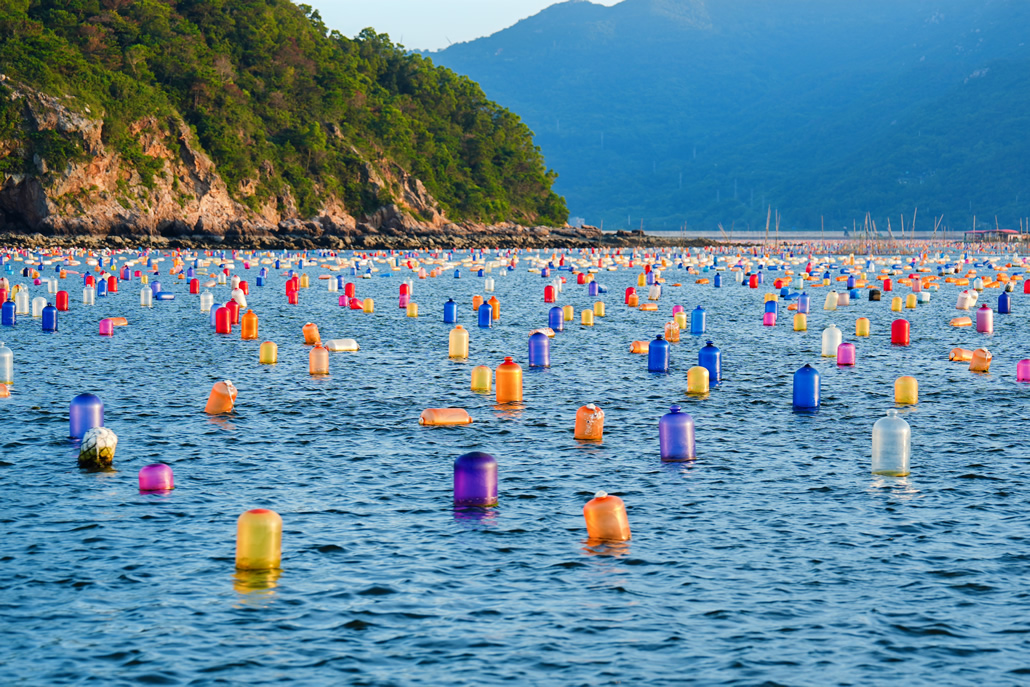 迎著清爽的海風(fēng),我們啟航駛?cè)肴绠嫷奈骶€海域。這里碧波萬頃,天光云影共徘徊,最令人驚嘆的是色彩斑斕的生態(tài)環(huán)保浮球方陣在朝陽映照下形成一片“彩虹?!薄R排列的浮球在陽光下閃爍,宛如一串串彩珠綴于蔚藍(lán)綢緞,勾勒出獨(dú)特的海洋詩畫。